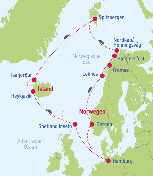 Hamburg – Lerwick – Reykjavik – Ísafjörður – Spitzbergen – Nordkap – Hammerfest – Tromsø – Leknes – Bergen – Hamburg