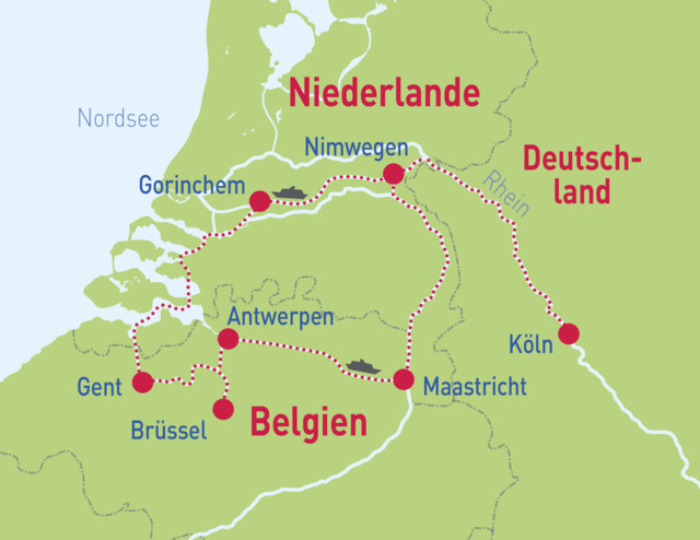 Köln – Gorinchem – Gent – Brüssel – Antwerpen – Maastricht – Nimwegen – Köln