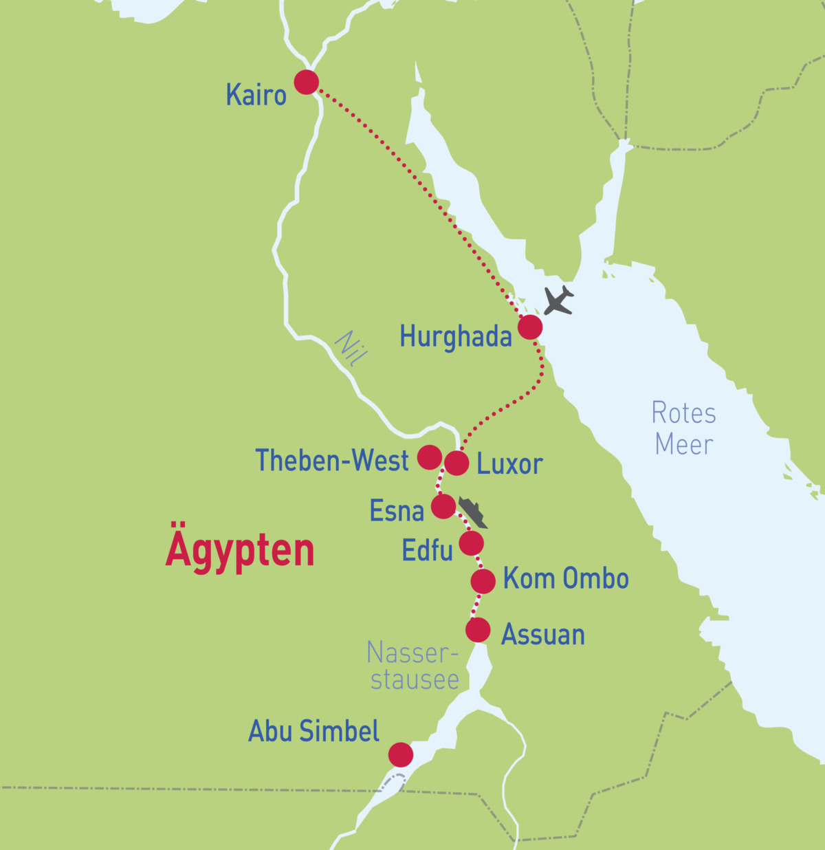 Ägypten – das Land der Pharaonen – bietet kulturellen Reichtum entlang des Nils. Eine Kreuzfahrt ist wohl die angenehmste Art all die einmaligen Sehenswürdigkeiten entlang des Nils aus erster Hand zu genießen. Nutzen Sie diese Chance und lernen Sie die altägyptische Kultur mit ihren vielen Sagen und Geheimnissen kennen. Es erwartet Sie eine Reise von Luxor bis Assuan, von der Gegenwart in die Vergangenheit und zurück. Höhepunkt ist das Große Ägyptische Museum und die Pyramiden von Gizeh. Das Rote Meer ist Inbegriff für einen unbeschwerten Erholungsurlaub. Auf dieser Reise erleben Sie zwei abwechslungsreiche Seiten dieses wundervollen Landes.
