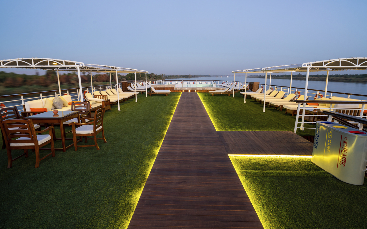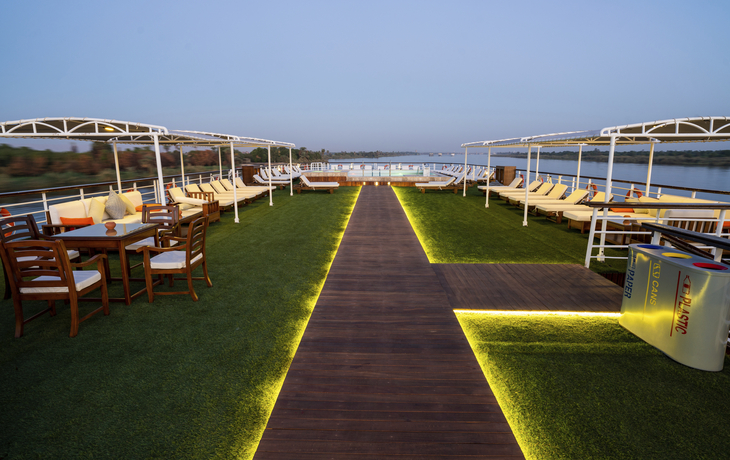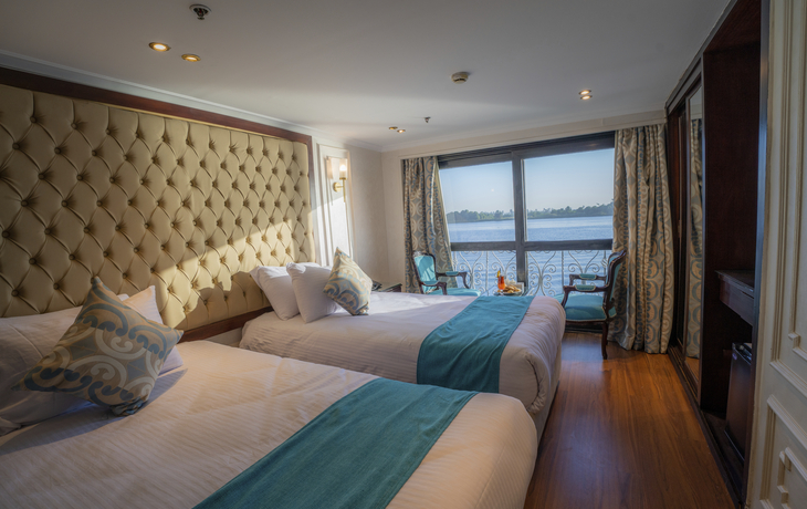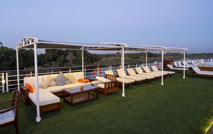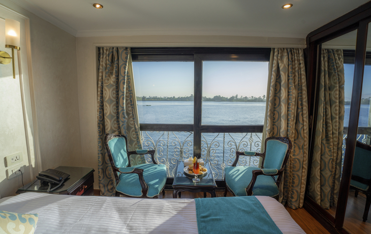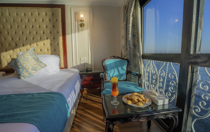 Wir haben für Ihre Nilkreuzfahrt ein 5-Sterne-Kreuzfahrtschiff reserviert, z.B. das *****Nilkreuzfahrtschiff "City and Sea Adonis". Es verfügt über ein elegantes Restaurant, eine geschmackvoll eingerichtete Lounge mit Bar, zwei Bordshops sowie einen Pool auf dem Sonnendeck. Die komfortabel eingerichteten Außenkabinen sind mit Bad oder Dusche/WC, Haartrockner, TV, Klimaanlage, Minikühlschrank und Safe ausgestattet.
