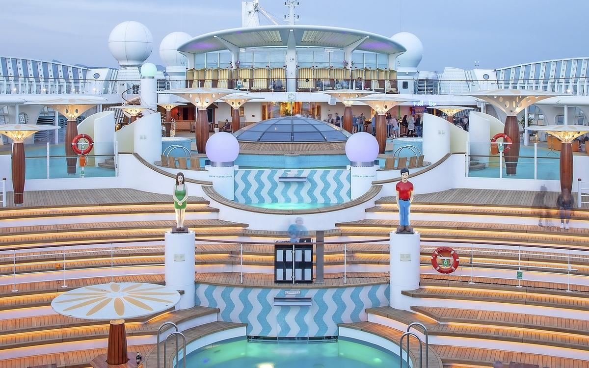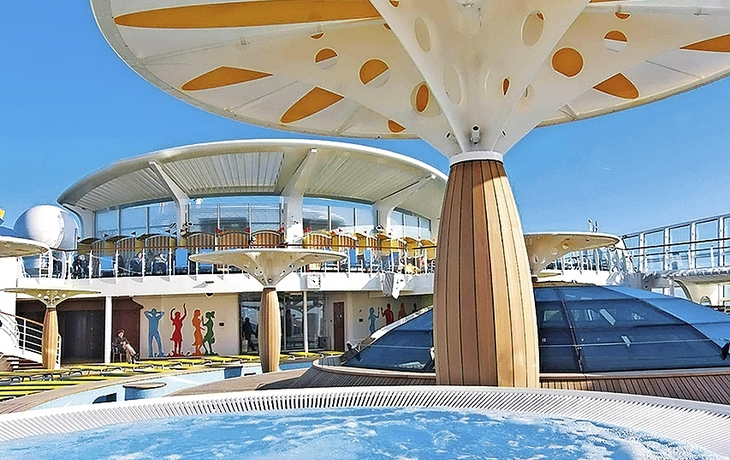 Sonnendecks mit Wasserlandschaft; Wellness-Oase mit Saunen, Solarium, Hamam, Friseur, uvm.; Fitnessstudio, Joggingparcours, Sportaußendeck.