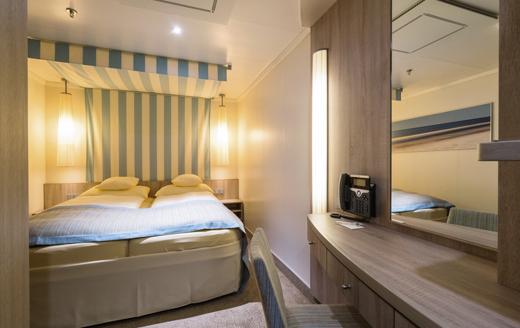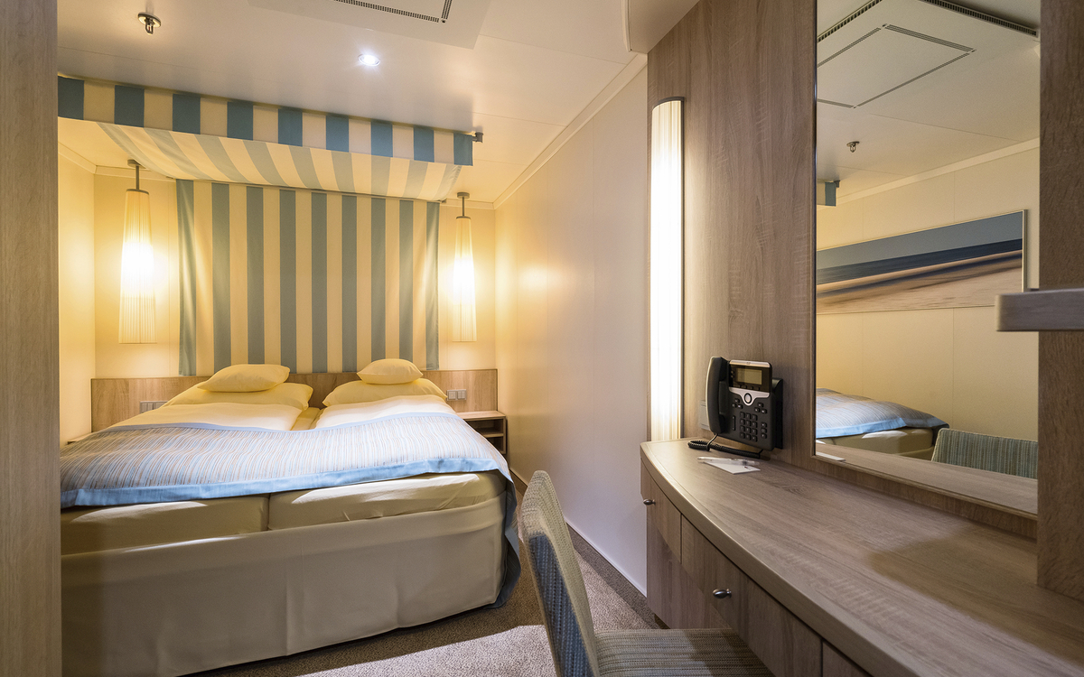 Die Kabinenverteilung innerhalb Ihrer gebuchten Kategorie obliegt der Reederei. Unsere Partnerreederei versucht, ihre Kabinenwünsche innerhalb Ihrer gebuchten Kategorie zu berücksichtigen, was jedoch nicht immer gelingt.