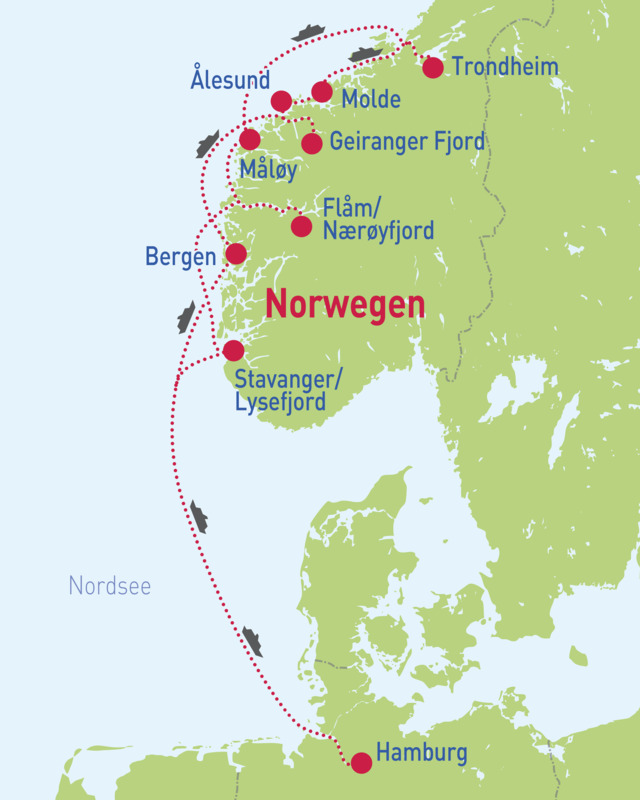 Hamburg – Bergen – Geirangerfjord – Ålesund – Molde – Trondheim – Måløy – Flåm – Stavanger – Hamburg