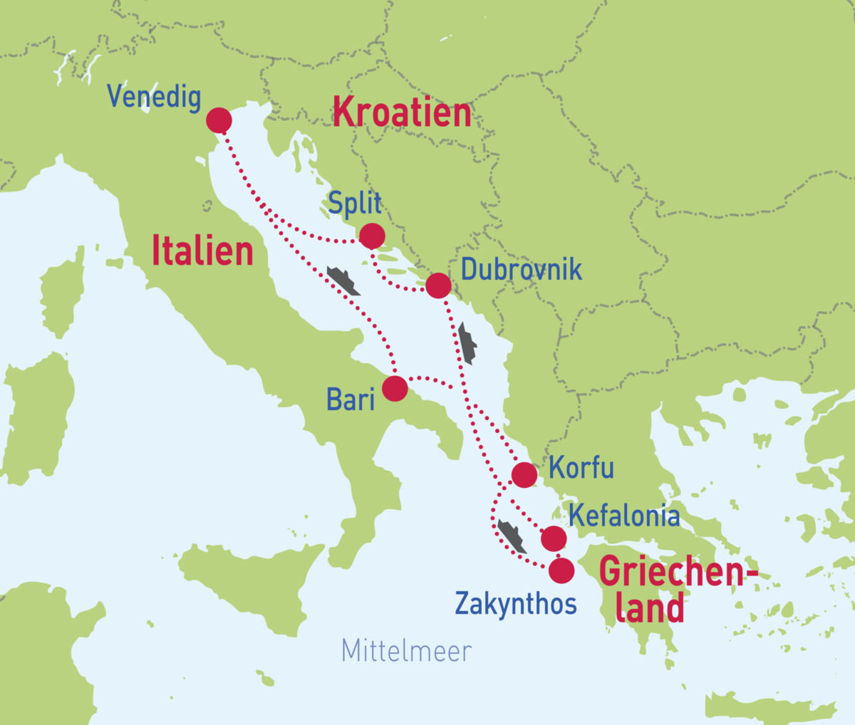 Unsere Traumroute führt uns von Venedig über Bari zu den griechischen Inselperlen Korfu, Zakynthos und Kefalonia. Genießen Sie das milde Klima der herrlichen Adria und entdecken Sie die wunderschönen Altstädte von Dubrovnik und Split.
