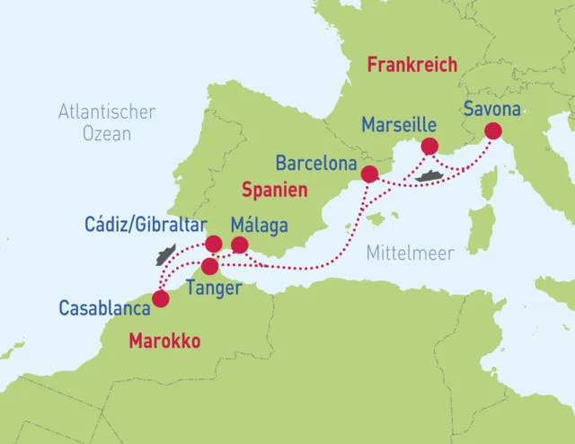 Savona – Barcelona – Tanger – Casablanca – Cádiz – Gibraltar – Málaga – Marseille – Savona