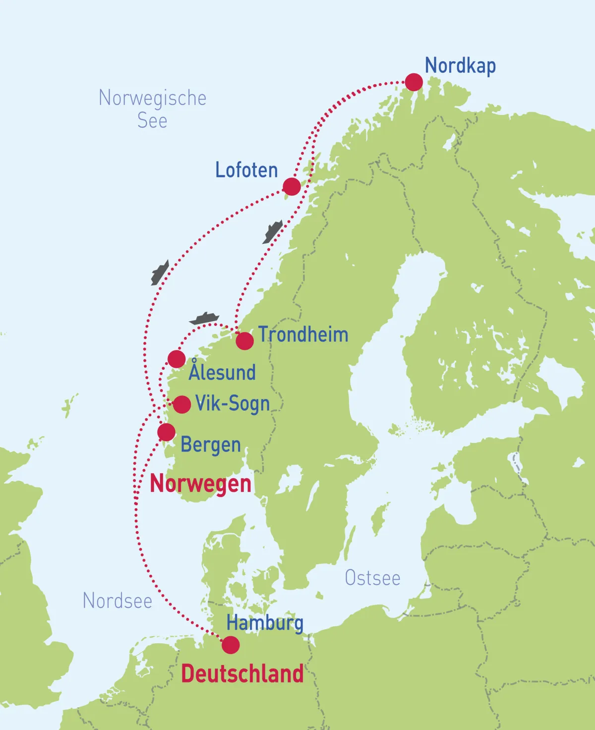 Hamburg – Bergen – Lofoten – Nordkap – Trondheim – Ålesund – Vik-Sogn – Hamburg
