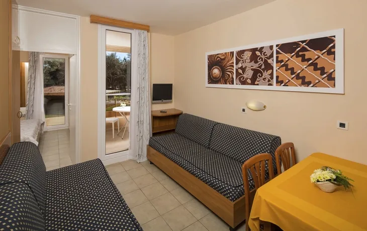 Die ***Apartments "Stella Plava Laguna" in Umag sind Bestandteil des Resorts "Stella Maris" und der perfekte Ort für einen erholsamen Urlaub in Istrien. Die ***Apartments "Stella Plava Laguna" liegen in einer mediterranen Vegetation nur wenige Gehminuten vom Meer entfernt. Das Meereswasser bei Umag ist mit dem Zertifikat "Blaue Flagge" bewertet worden und steht für die außergewöhnliche Reinheit des Meeres und der Strände. Die Anlage "Stella Maris Resort" bietet unterschiedliche Lokalitäten, z.B. das "Stella Maris Restaurant" mit Halbpensionsmöglichkeit (Frühstücks- und Abendessen-Buffet), mehrere Themenrestaurants, Snack Bars und Café Bars. In der Ferienanlage befinden sich ein Meerwasserpool und ein Pool für Kinder. Eine Vielzahl sportlicher Aktivitäten ist möglich, z.B. Wassergymnastik, Pilates, Yoga, Aerobic, Tauchen, Fahrrad fahren u.v.m. (Aktivitäten z.T. gegen Aufpreis vor Ort und saisonal begrenzt) Am Abend finden verschiedene Veranstaltungen wie Liveshows, thematische Abende oder die Auftritte des Animationsteams statt. Die Apartments haben eine Fläche von ca. 28 qm und sind für maximal 3 Personen geeignet. Sie verfügen über Bad oder Dusche/WC, ein Schlafzimmer mit 2 Betten, ein Wohnzimmer mit einem ausziehbaren Sessel, Küchenzeile, Klimaanlage, Telefon, Sat-TV und Balkon.