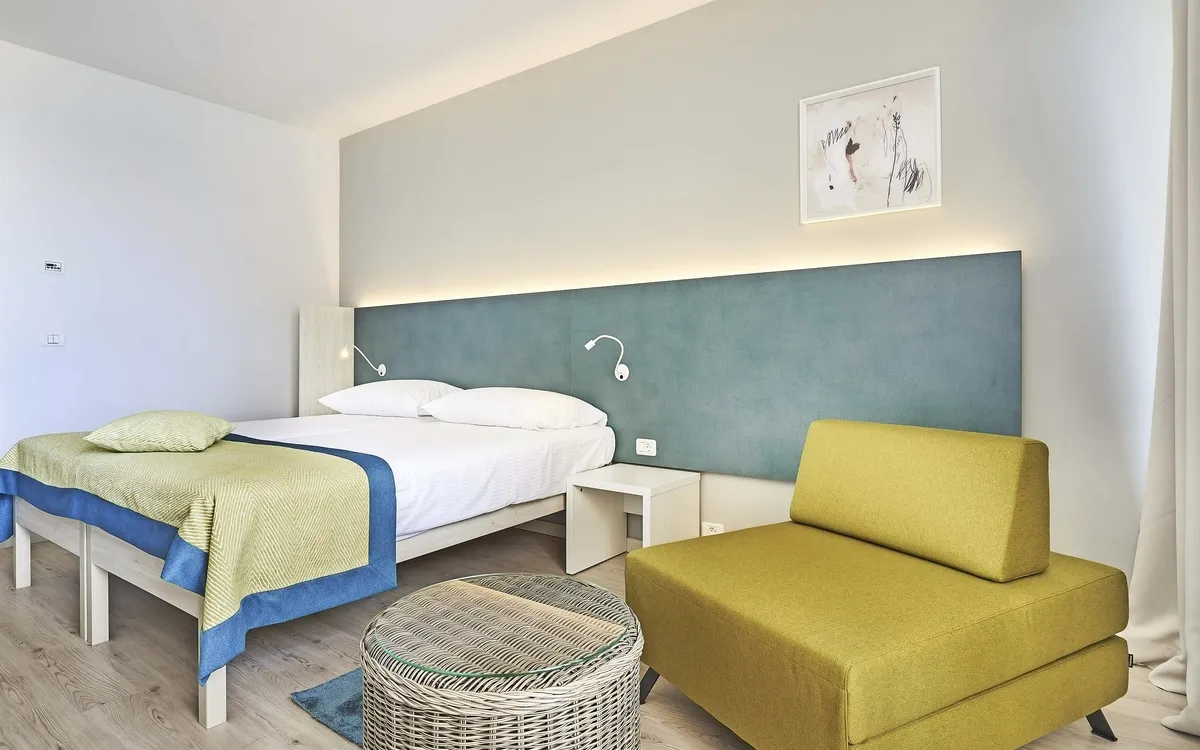 Ihr ***Hotel "Materada Plava Laguna" in Poreč liegt direkt am Meer und ist nur wenige Gehminuten vom Strand entfernt. Ihr charmantes und modernes Urlaubshotel ist umgeben von weitläufigen Parks, mediterranen Gärten und zahlreichen Rasenflächen zum Sonnenbaden. Der ideale Platz für echte Erholung. Entlang der Uferpromenade erreichen Sie das wunderschöne Städtchen Poreč zu Fuß bereits in einer halben Stunde oder bequem mit dem örtlichen Bähnchen (Hauptsaison). In der Nähe des Hotels befinden sich Volleyball- und Fußballplätze und am Strand können Sie verschiedene Wassersportarten ausprobieren. (Aktivitäten z. T. gegen Aufpreis vor Ort und saisonal begrenzt) In Ihrem Hotel erwarten Sie ein Außenpool, ein Restaurant, eine Aperitif- und Poolbar, einen Massagesalon sowie ein Friseur. Die Nutzung von kostenfreiem Wi-Fi ist inbegriffen. Zum Abendessen sind Getränke vom Fass (Saft, Wasser, Tischwein weiß und rot, Bier) im Preis inbegriffen. Ihre Zimmer verfügen über Bad oder Dusche/WC, Haartrockner, Telefon, Sat-TV und Balkon.