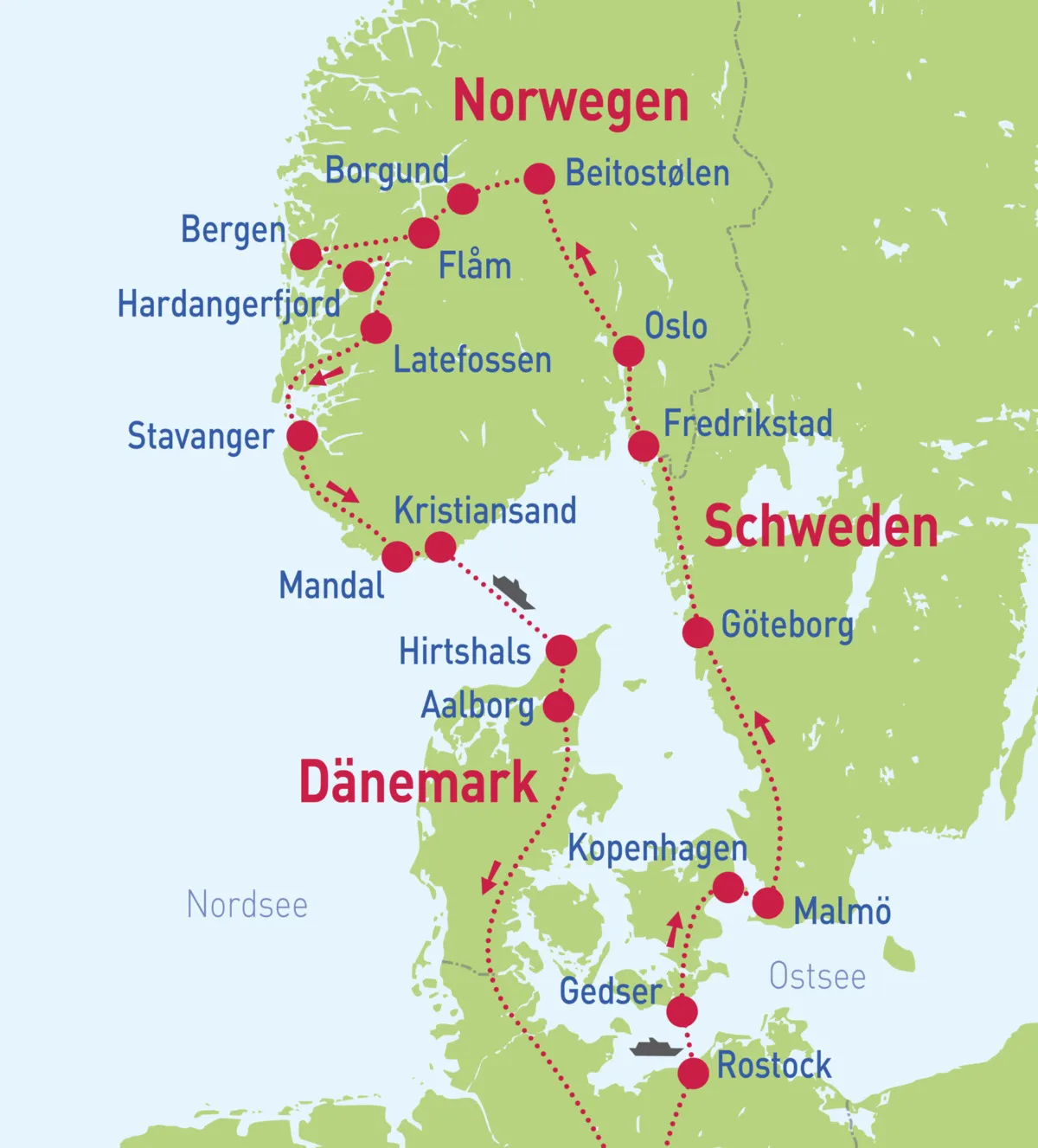 Über die Europastraße 39 geht es in die schöne Stadt Mandal, berühmt für ihre Sandstrände und die schöne Fußgängerzone mit ihren bunten Holzhäusern. Weiterfahrt nach Kristiansand, Fährüberfahrt nach Hirtshals. Übernachtung im Raum Hirtshals/Aalborg.
