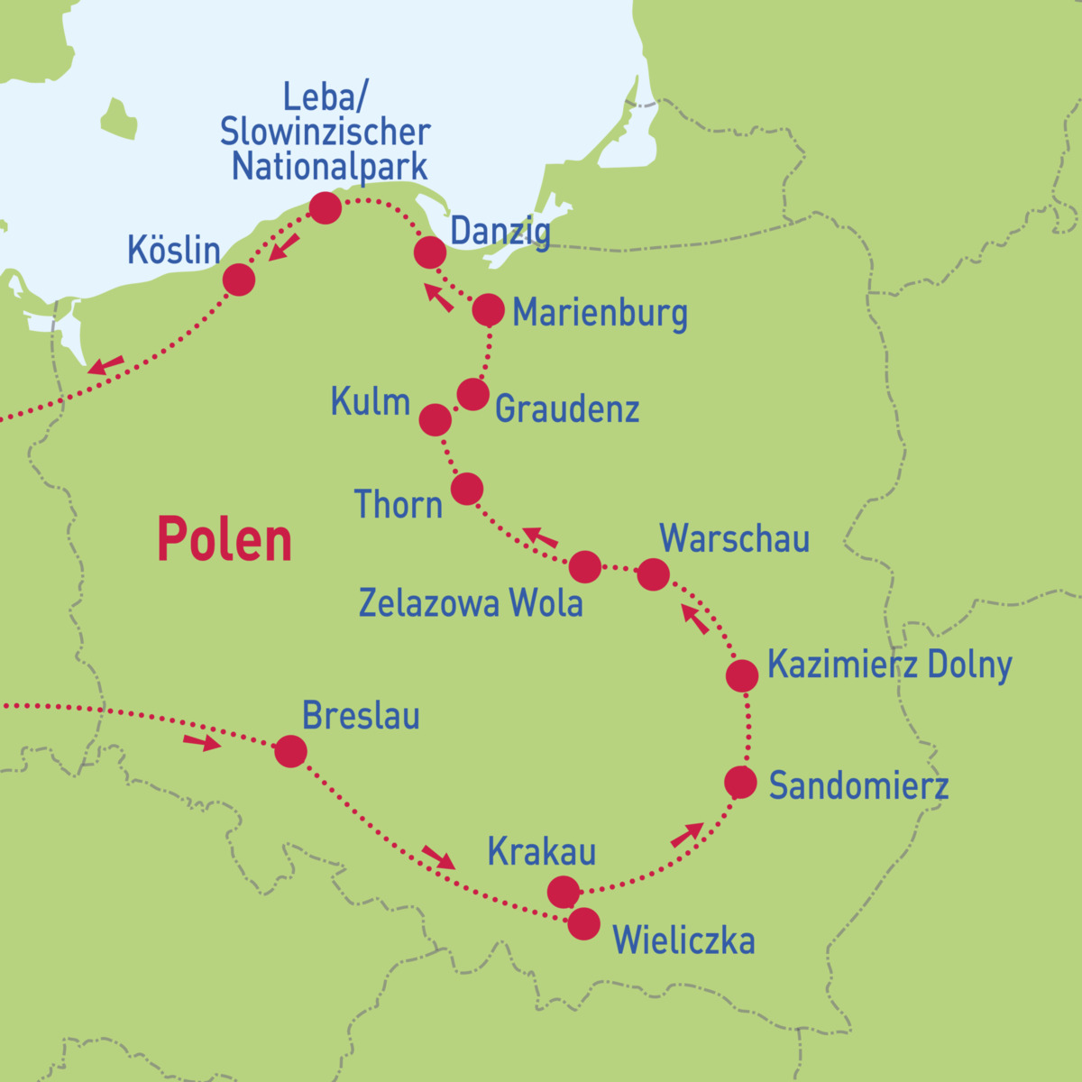 Sie wollen die wahren Glanzlichter Polens kennenlernen? Dann begleiten Sie uns auf unsere Reise, die Sie von der Oder und entlang der Weichsel bis an die Ostseeküste führt. Neben den schönsten Städten des Landes lernen Sie auch romantische Landschaften, z.B. die polnische Toskana, kennen und verweilen an Orten, wie Chopins Geburtsort, die prägend für das Land und seine Menschen sind.