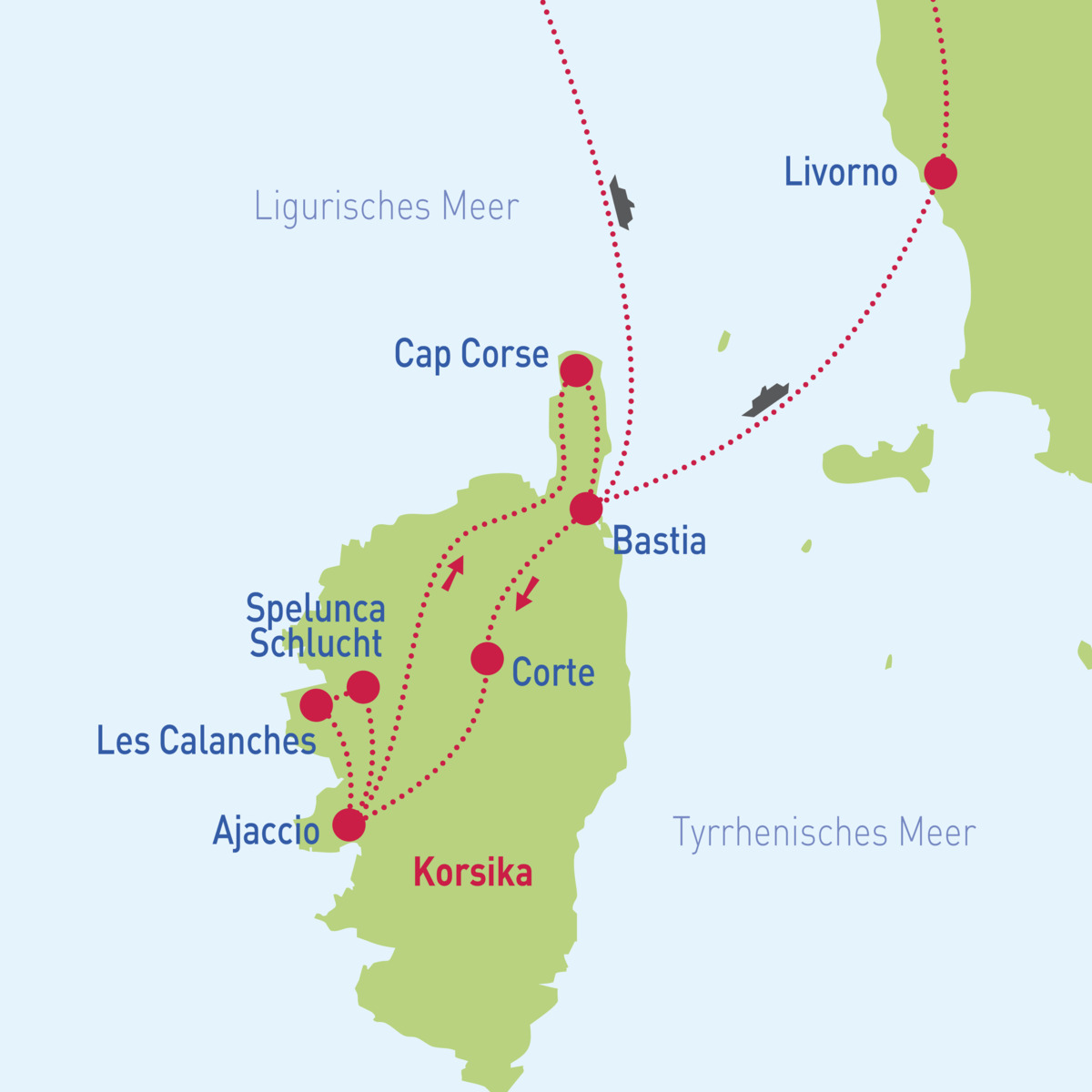 Nach dem Frühstück Weiterfahrt Richtung Livorno. Hier geht es für Sie auf die Fähre nach Bastia. Übernachtung im Raum Bastia.