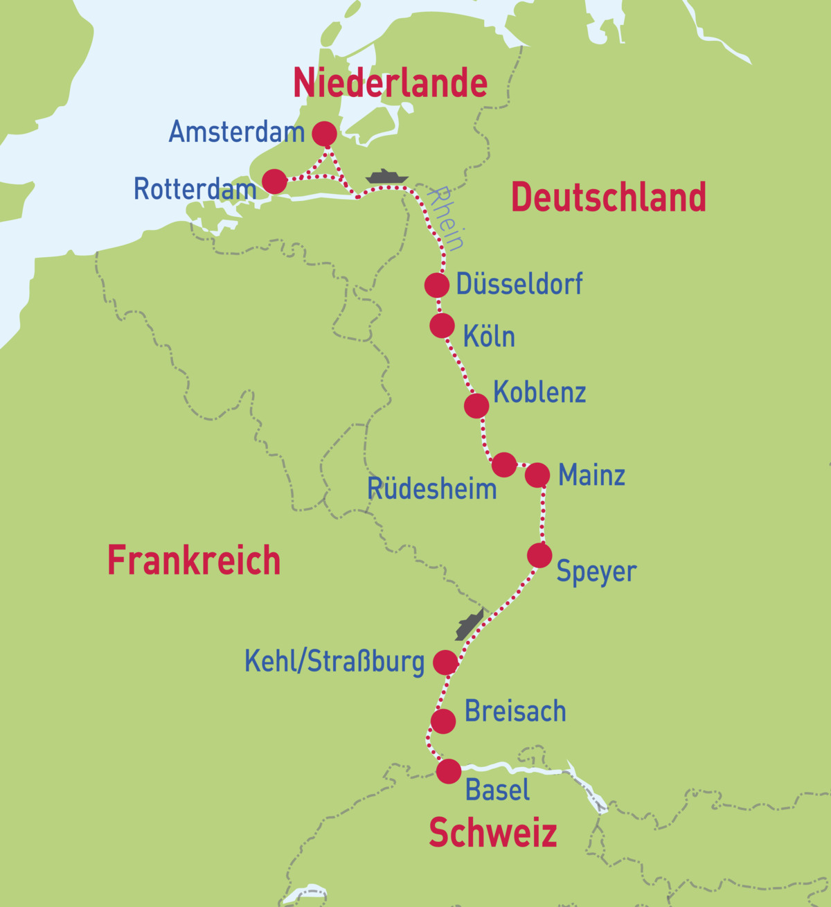 Köln – Rotterdam – Amsterdam – Düsseldorf – Koblenz – Breisach – Basel – Elsass – Mainz – Köln