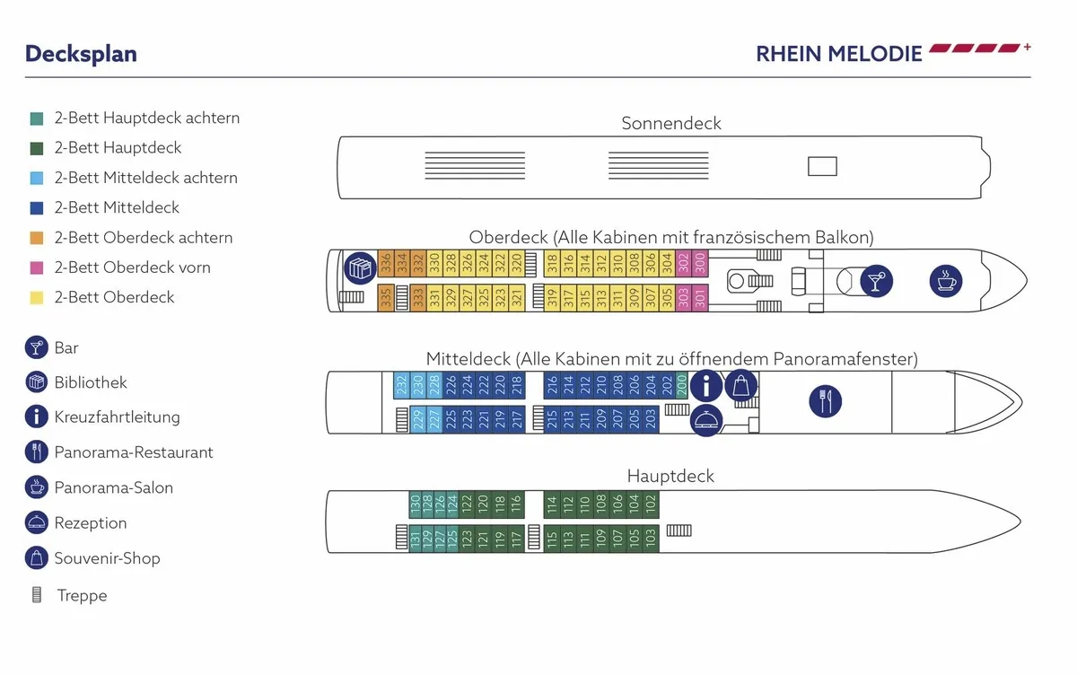 Moderne trifft Komfort an Bord unserer "RHEIN MELODIE". Über 132 Meter Länge erstreckt sich dieses luxuriöse Flussschiff mit höchsten Ansprüchen an Design. Die überaus großzügigen Kabinen bieten alle Annehmlichkeiten und grandiose Aussichten auf die Rheinufer. Aber nicht nur in den Kabinen: Egal, wo man sich auf diesem Schiff aufhält, große Panoramafenster eröffnen ein grandioses Flusskino. Grandios ist auch die Küche an Bord. Täglich werden kulinarische Genüsse geboten, die Kreuzfahrerherzen höher schlagen lassen. Es erwarten Sie ein Panorama-Restaurant, ein Panorama-Salon mit Bar, eine Bibliothek sowie ein Sonnendeck mit Sonnensegel, Liegestühlen und Tischen. Die Bordwährung ist Euro, die Zahlung erfolgt in bar, mit EC-Karte oder Kreditkarte (Mastercard, VISA, PIN-Nummer erforderlich). Die Stromspannung ist 220 V.