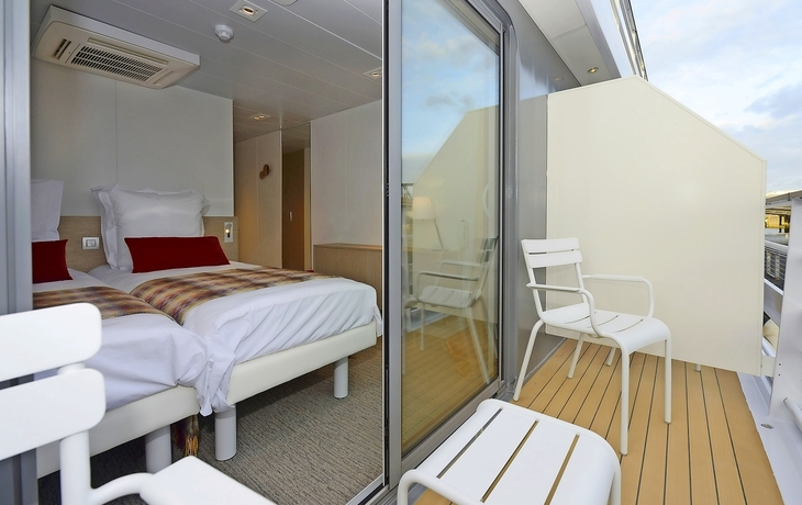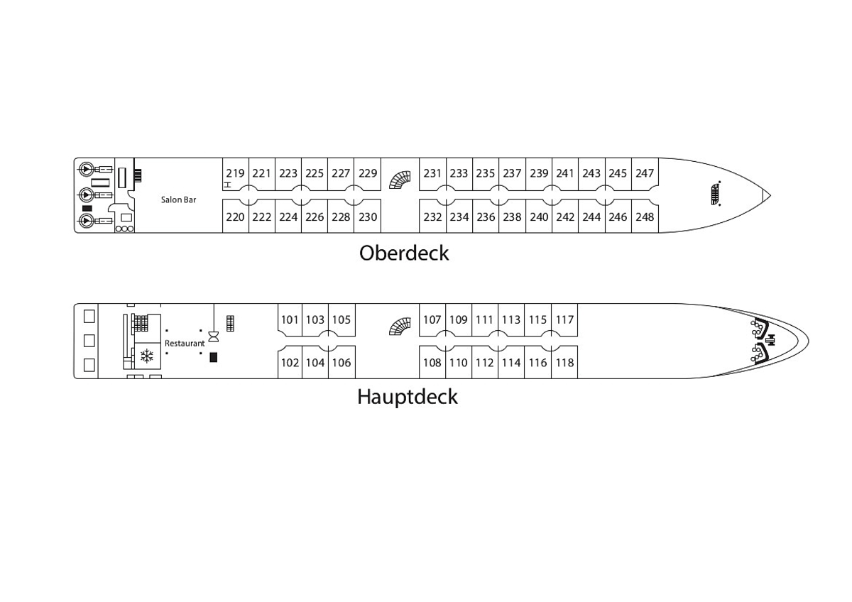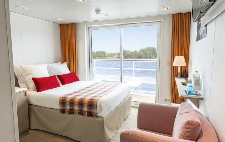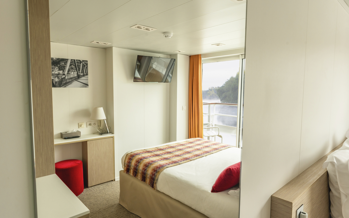 Sie logieren in einer von 48 komfortablen ca. 15 m² großen Außenkabinen. Die Kabinen auf dem Hauptdeck haben nicht zu öffnende Panoramafenster, die Kabinen auf dem Oberdeck verfügen über einen Balkon (ca. 3 m²). Ausgestattet sind alle Kabinen mit einem Doppelbett oder zwei Einzelbetten, Dusche, WC, Haartrockner, TV, Radio, Safe, Minibar und einer individuell regulierbaren Klimaanlage.