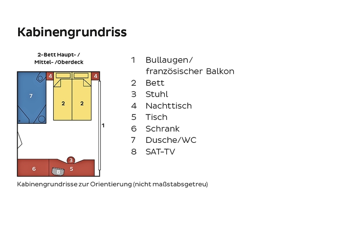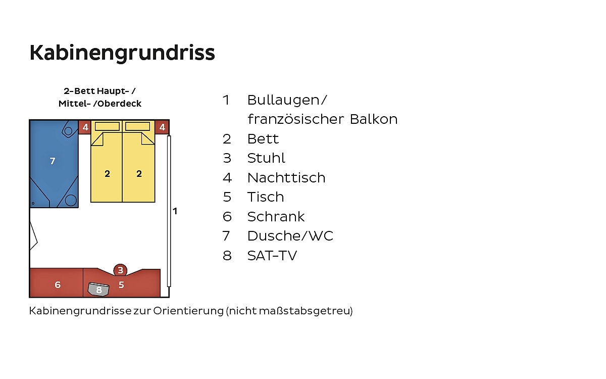 Unsere Partnerreederei versucht, Ihre Kabinenwünsche innnerhalb Ihrer gebuchten Kategorie zu berücksichtigen, was jedoch nicht immer gelingt.