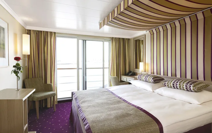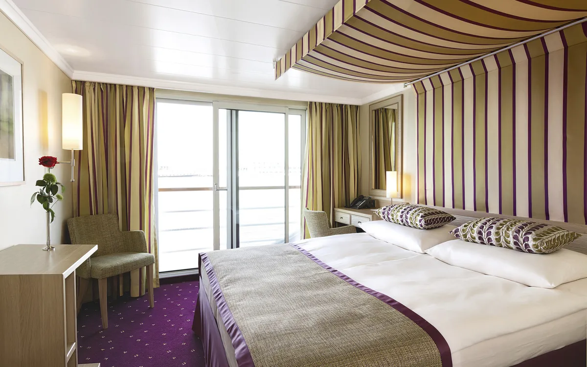 Alle Kabinen sind außenliegend und mit 14,5 m² großzügig geschnitten, somit sehr komfortabel. Das elegante Design und die edlen Materialien sprechen für sich. Die Ausstattung inkludiert DU/WC, Haartrockner, Telefon, TV, Klimaanlage und Safe. Die Kabinen auf Deck 2 und 3 verfügen über einen französischen Balkon, die Fenster auf Deck 1 sind nicht zu öffnen. Alle Kabinen der Kategorie A, C und D sind mit Doppelbetten ausgestattet, Kabinen der Kategorie S mit zwei Einzelbetten.