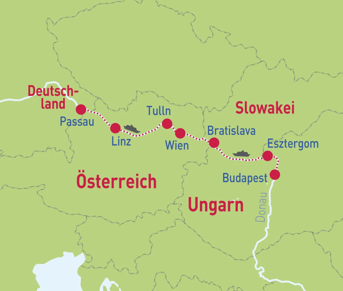 Passau – Tulln – Bratislava – Budapest – Esztergom – Wien – Linz – Passau