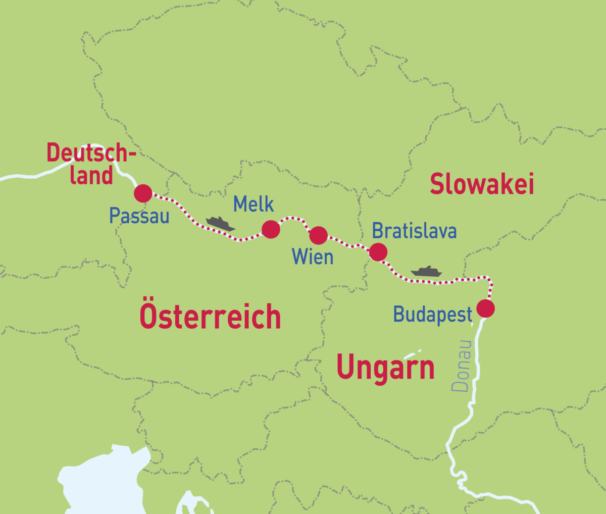 Wir zeigen Ihnen die absoluten Höhepunkte am oberen Teil der Donau. Drei glanzvolle Städte stehen dabei auf Ihrem Reiseplan: Das lebensfrohe und musikalische Wien, Bratislava, die Krönungsstadt ungarischer Monarchen, und die geschichtsträchtige Metropole Budapest. Zwischendurch lernen Sie die zauberhafte Landschaft der Donauregion Wachau kennen. Das UNESCO-Weltkulturerbe erwartet Sie mit malerischen Städtchen und dem eindrucksvollen Stift Melk.