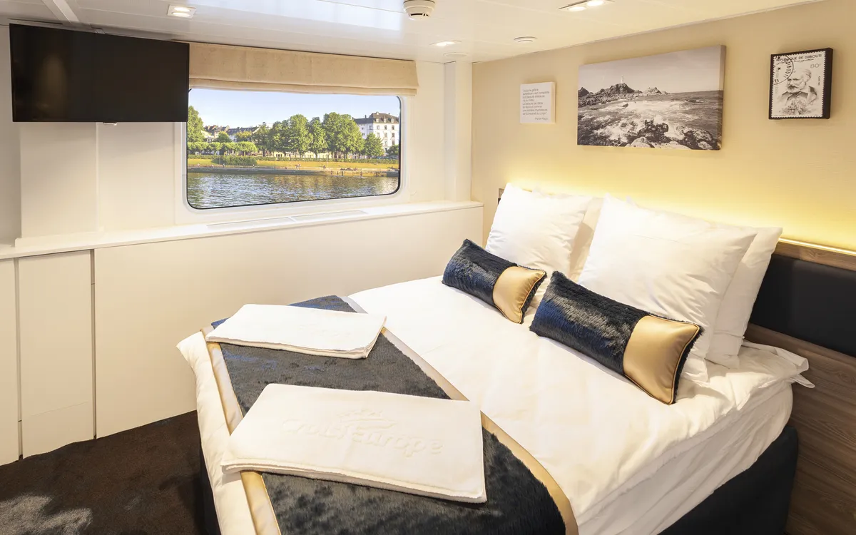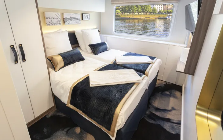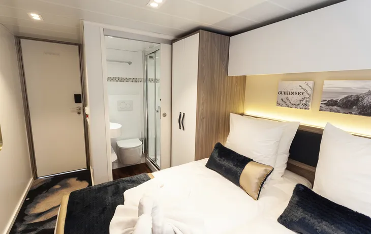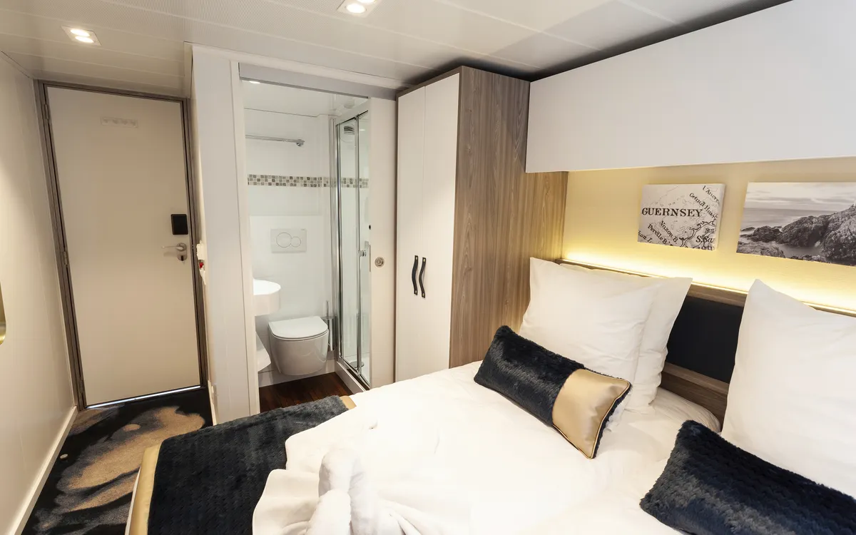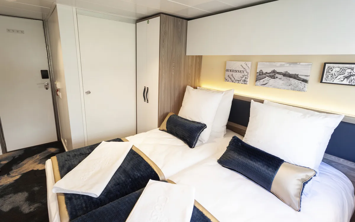 Bei allen Kabinen handelt es sich um Außenkabinen mit einer Grundfläche von 12 m². Alle Kabinen verfügen über zwei Betten, die entweder getrennt oder zusammenliegend angeordnet sind. Zur Ausstattung gehören Dusche/WC, Haartrockner, TV, Safe, Haustelefon und eine individuell regulierbare Klimaanlage. Die Kabinen haben große Panoramafenster, auf dem Oberdeck geht der obere Teil der Fenster aufzuschieben.
