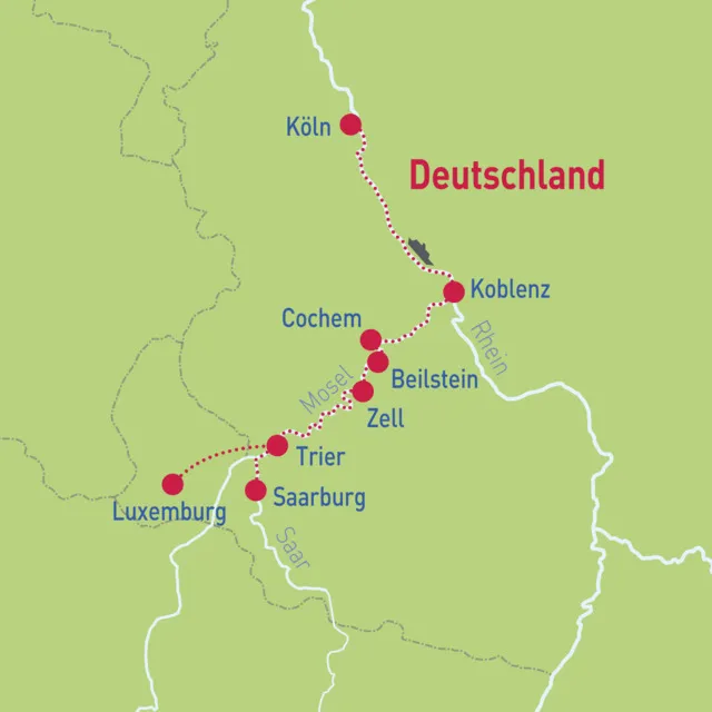 Köln – Beilstein – Trier – Luxemburg – Saarburg – Saarschleife – Zell – Cochem – Koblenz – Köln
