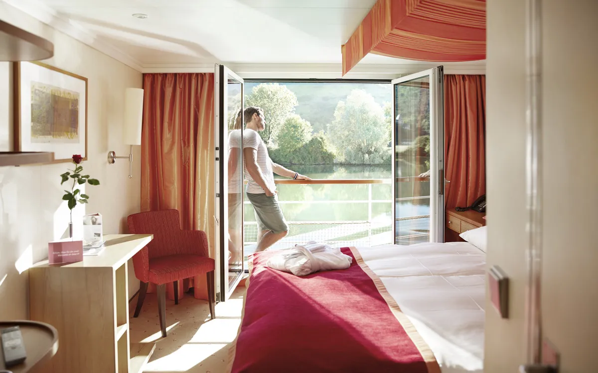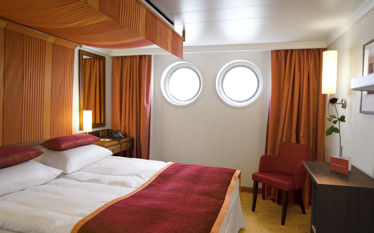 Alle Kabinen sind außenliegend und mit 14,5 m² großzügig geschnitten, somit sehr komfortabel. Das elegante Design und die edlen Materialien sprechen für sich. Die Ausstattung inkludiert DU/WC, Haartrockner, Telefon, TV, Klimaanlage und Safe. Die Kabinen auf Deck 2 und 3 verfügen über einen französischen Balkon, die Fenster auf Deck 1 sind nicht zu öffnen. Alle Kabinen der Kategorie A, C und D sind mit Doppelbetten ausgestattet, Kabinen der Kategorie S mit zwei Einzelbetten.