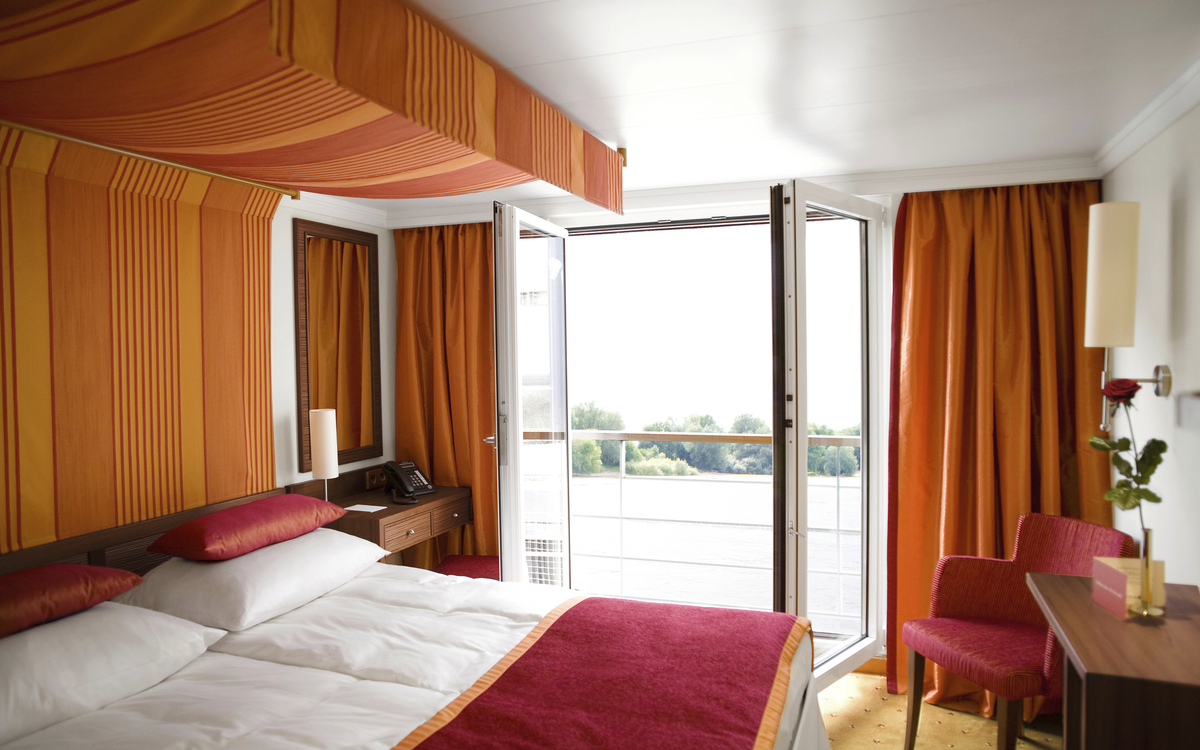 Alle Kabinen sind außenliegend und mit 14,5 m² großzügig geschnitten, somit sehr komfortabel. Das elegante Design und die edlen Materialien sprechen für sich. Die Ausstattung inkludiert DU/WC, Haartrockner, Telefon, TV, Klimaanlage und Safe. Die Kabinen auf Deck 2 und 3 verfügen über einen französischen Balkon, die Fenster auf Deck 1 sind nicht zu öffnen. Alle Kabinen der Kategorie A, C und D sind mit Doppelbetten ausgestattet, Kabinen der Kategorie S mit zwei Einzelbetten.