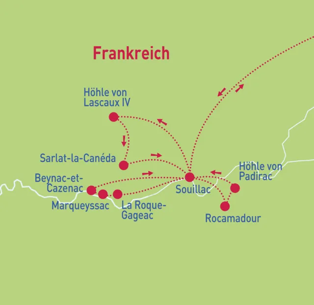 Auf unserer heutigen Entdeckungstour durchs Périgord folgen wir dem Flusslauf der Dordogne. In Beynac-et-Cazenac tauchen wir in das historische Leben dieser Region ein. Mächtig und imposant ragt die Mittelalterburg am Flusslauf empor. Besichtigung der mittelalterlichen Burg. Es folgt eine Schifffahrt auf der Dordogne ab Beynac. Zur Mittagszeit erreichen wir La Roque-Gageac, einen der schönsten Orte in Frankreich. Er ist malerisch zwischen einer steilen Felswand und dem ruhigen Flusslauf der Dordogne gebettet. Die Häuser reihen sich im Bogen des Flusses und ein fast schon mediterranes Klima überspannt den kleinen Ort. Ein weiterer Höhepunkt des Tages sind die Gärten und das Schloss von Marqueyssac, die gern auch als "Die hängenden Gärten von Marqueyssac" bezeichnet werden. Dieses Meisterwerk der Landschaftsgärtnerei können Sie durchstreifen. Die Lage auf dem überhängenden Plateau eröffnet grandiose Aussichten auf Fluss und Land. Zurück in Souillac zeigt Ihnen unsere örtliche Reiseleitung noch die hiesige Abtei (Außenbesichtigung).