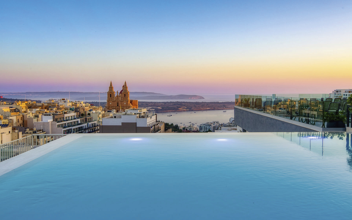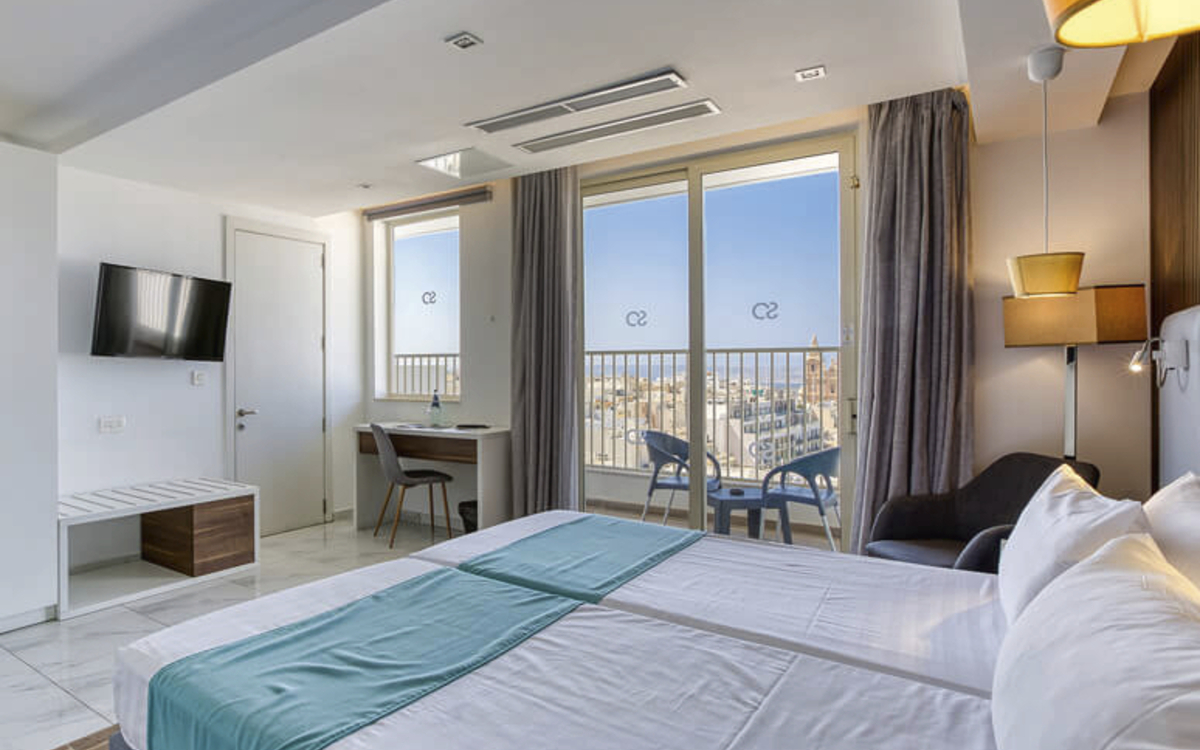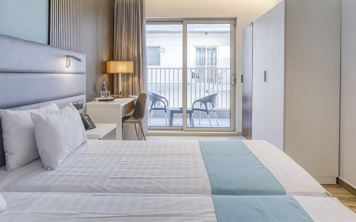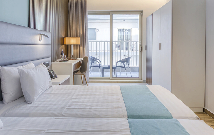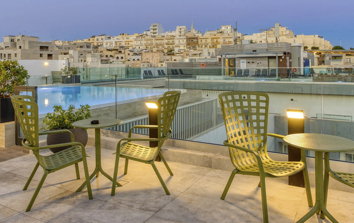 Das ****"Solana Hotel & Spa" befindet sich im Zentrum des Dorfes Mellieha, ca. 10 Gehminuten vom Strand entfernt. Es verfügt über Restaurant, Bar, Lift, Konferenzraum, Fitnesscenter, Pool und Terrasse. Die 100 Zimmer sind mit Bad oder Dusche/WC, Haartrockner, Telefon, TV und Klimaanlage ausgestattet.