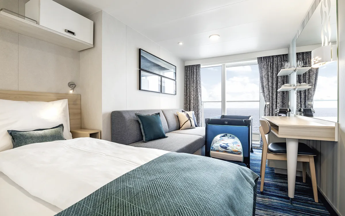 Die modern, hell und freundlich eingerichteten Innen- und Außenkabinen verfügen über Klimaanlage/Heizung, Bad mit Dusche/WC, Föhn, Leihbademäntel, Espresso-Maschine, Flachbildschirm, Telefon, Safe und zwei einzelnen unteren Betten, die zu einem Doppelbett arrangiert werden können. Die Balkonkabinen bieten zusätzlich raumhohe Glastüren, die zu einem ca. 5 m² großen privaten Balkon mit einem Tisch und 2 Stühlen führen.