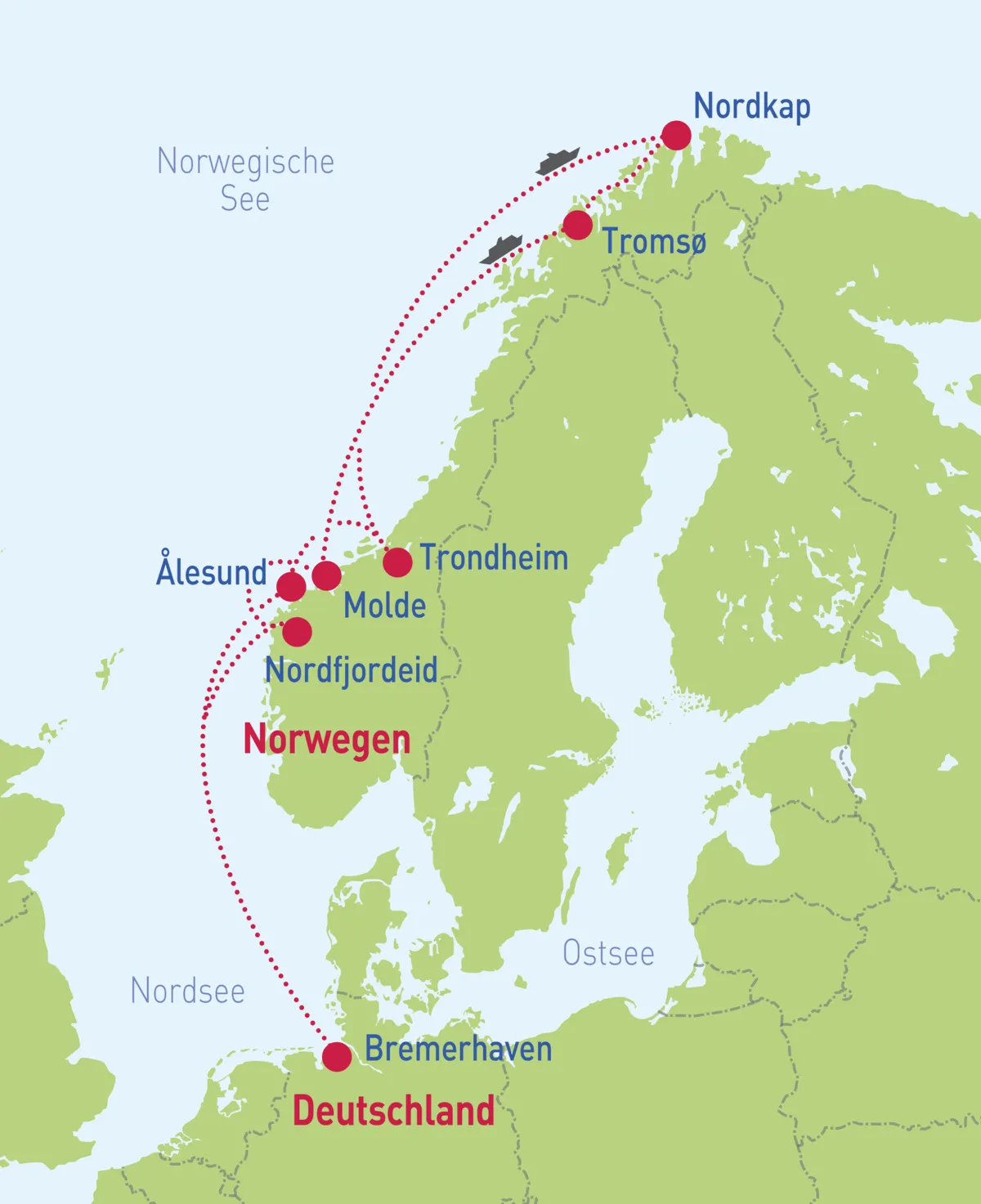 Bremerhaven – Ålesund – Trondheim – Honningsvåg/Nordkap – Tromsø – – Nordfjordeid – Haugesund – Bremerhaven
