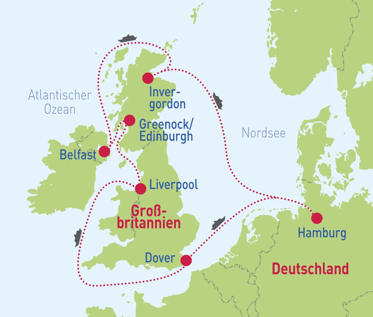 Hamburg – Invergordon – Belfast – Greenock/Edinburgh – Liverpool – Dover – Hamburg