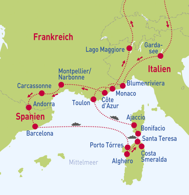 Côte d’Azur – Carcassonne – Andorra – Barcelona – Sardinien – Korsika – Toulon – Monaco