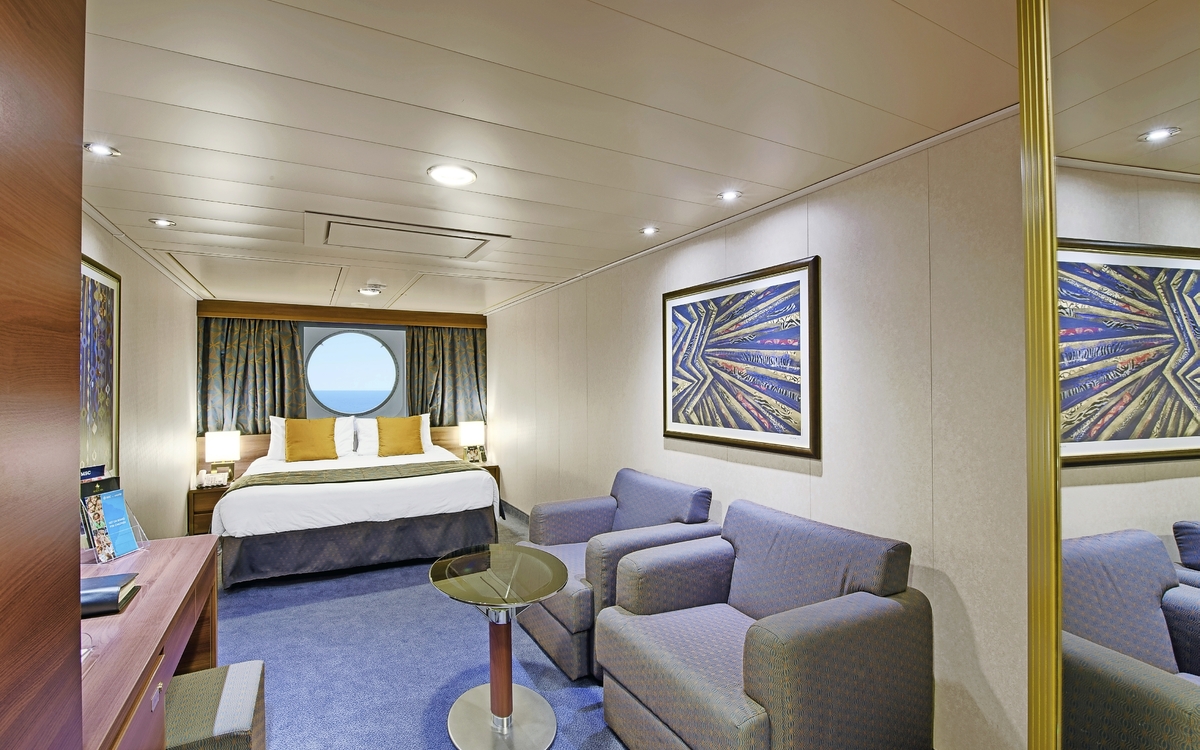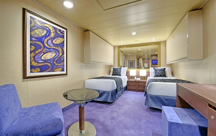 Alle Kabinen sind klimatisiert und verfügen über Dusche/WC, Haartrockner, interaktives TV, Telefon, Minibar und Safe.