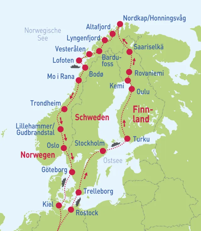 Erleben Sie den nördlichsten Festlandpunkt Europas – das Nordkap, sowie das einmalige Naturschauspiel der Inselwelt der Lofoten und Vesterålen. Der Weg durch die schwedisch-finnische Seenlandschaft und die sehenswerten norwegischen Städte runden diese abwechslungsreiche Reise ab.