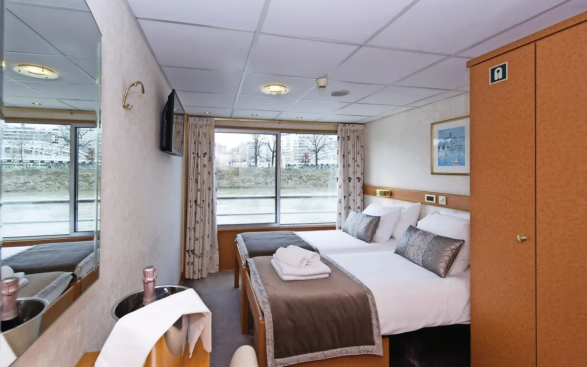 Bei allen Kabinen handelt es sich um Außenkabinen mit einer Grundfläche von 11-14 m². Alle Kabinen verfügen über zwei untere Betten, die entweder getrennt oder zusammenliegend angeordnet sind. Zur Ausstattung gehören Dusche/WC, TV, Safe, Haustelefon und eine individuell regulierbare Klimaanlage. Die Kabinen haben Panoramafenster, die Oberdeck-Kabinen verfügen über einen französischen Balkon.