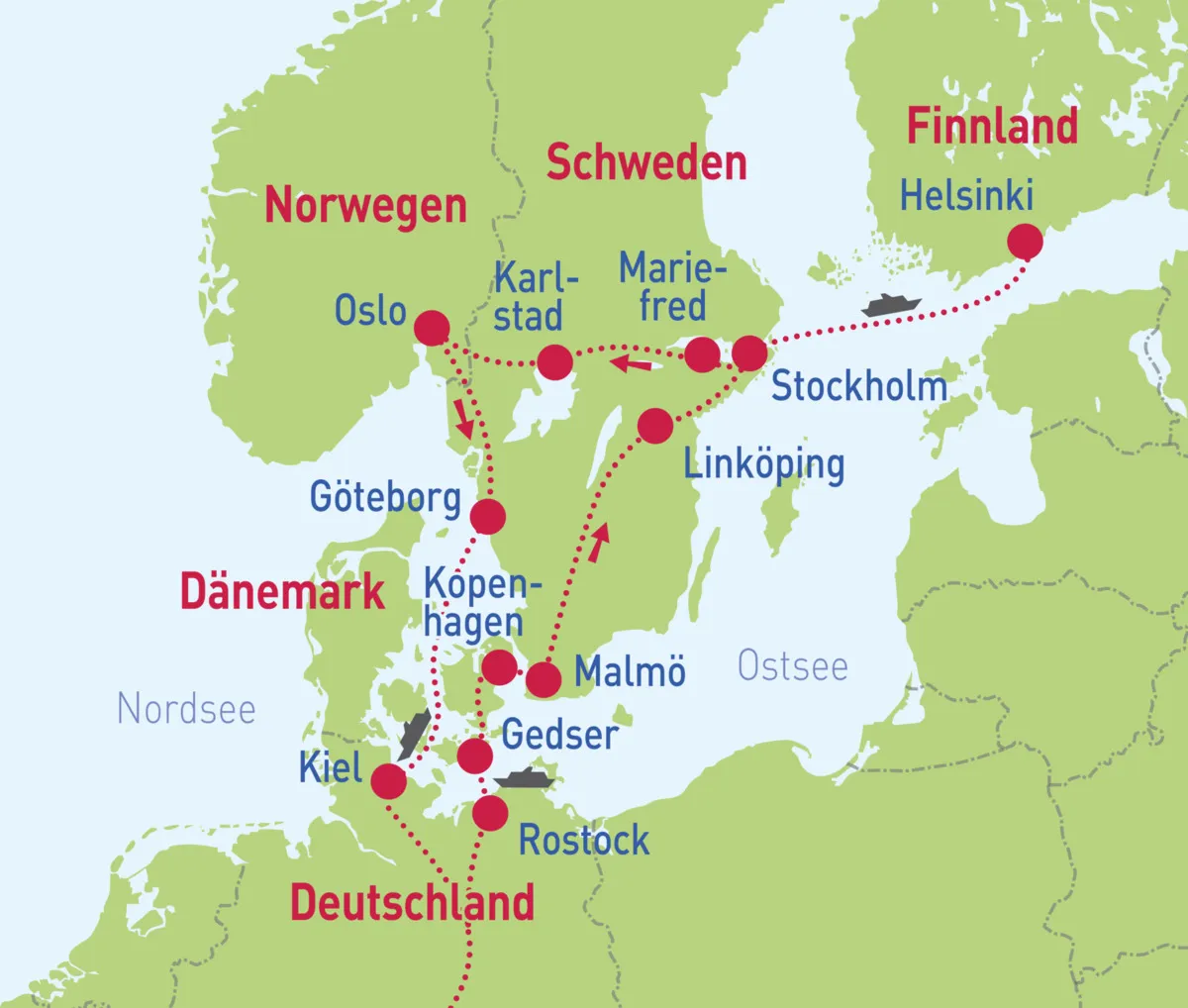 Abfahrt von den Ausgangsorten am frühen Morgen gen Norden. Fährüberfahrt von Rostock nach Gedser. Am Nachmittag erreichen Sie Kopenhagen. Hier lernen Sie während einer Stadtrundfahrt die dänische Hauptstadt näher kennen. Über die berühmte Öresundbrücke geht es zum Hotel im Raum Malmö zur Übernachtung.