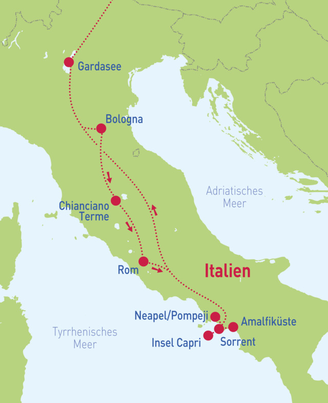 Kommen Sie mit auf eine einmalige Reise in das wunderschöne Italien. Besuchen Sie mit uns die Highlights, die das Land zu bieten hat. Zu den Höhepunkten Italiens gehört die Insel Capri, welche durch ihre Naturschönheiten zu den berühmtesten Reisezielen der Welt gehört. Verbringen Sie acht grandiose Tage mit unvergesslichen Erlebnissen.