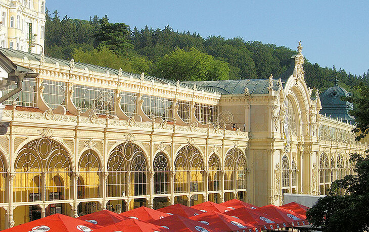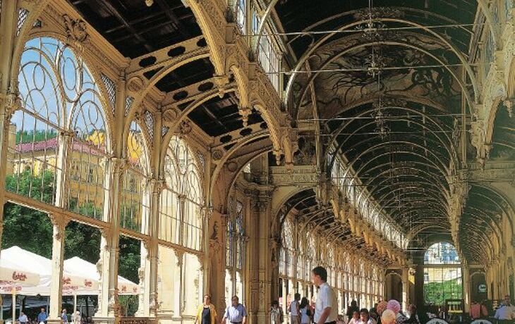 1889 wurden diese imposanten Säulengänge erbaut. Verziert mit Ornamenten im Stil der Neorenaissance ist die gusseiserne Konstruktion eines der bedeutendsten Baudenkmäler Marienbads. In enger Nachbarschaft befinden sich die Kolonnaden zahlreicher Heilquellen.