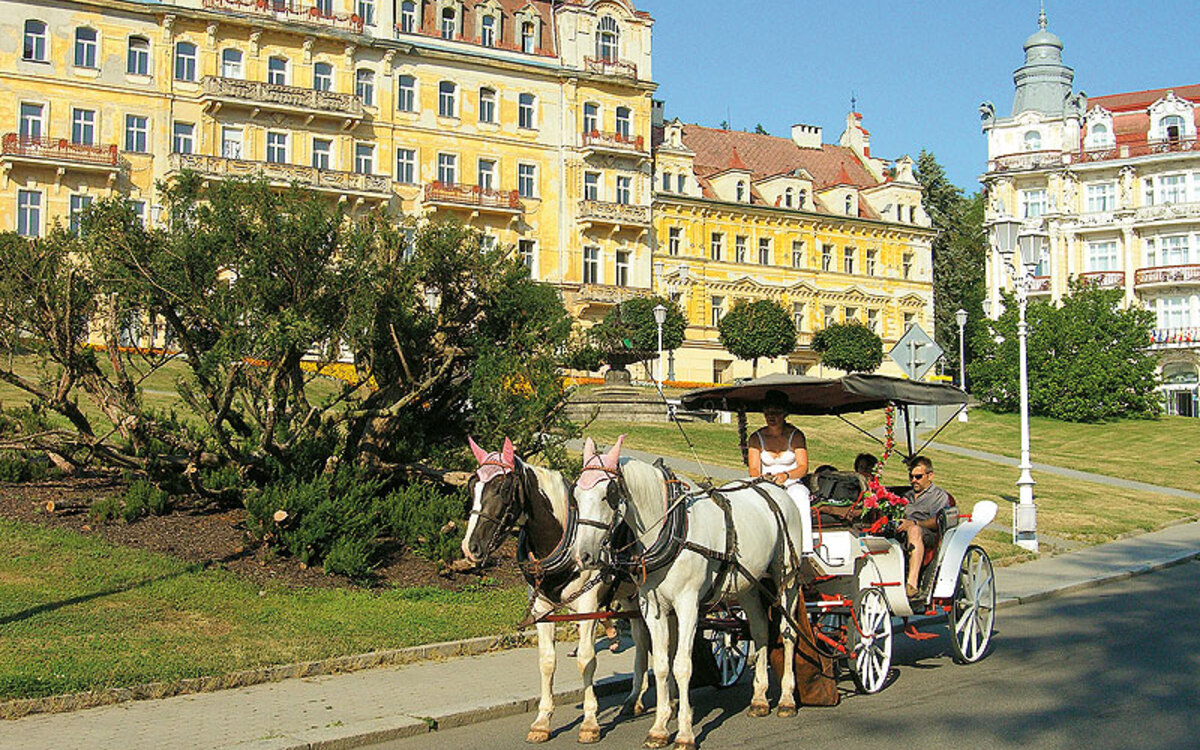 Marienbad gilt als einer der wohl schönsten westböhmischen Kurorte und verzaubert jährlich tausende Kur- und Gesundheitsurlauber mit seinem besonderen Ambiente. Rund 40 Heilquellen, die reine Luft, prächtige Bauten und wunderschöne Parkanlagen prägen das Bild des mondänen Kurorts. Weltweit ist Marienbad bekannt für die heilende Wirkung seiner Quellen (Säuerlinge), deren kaltes Heilwasser besonders reich an Kohlensäure und Mineralsalzen ist. Bereits im 17. Jahrhundert wussten die Menschen der näheren Umgebung um die heilende Wirkung der Bodenschätze des damaligen Sumpfgebiets. Nach der Erforschung deren Heilkraft wurde aus der ehemaligen Sumpflandschaft nach und nach ein ansehnlicher Kurort mit herrlichen Kuranlagen und Bauten sowie einem gepflegten Kurpark. Nach einer grundlegenden Sanierung Ende des 20. Jahrhunderts erstrahlt Marienbad heute in neuem Glanz. Bis heute strömen jährlich tausende Besucher aus aller Welt in das Kurparadies Tschechiens.